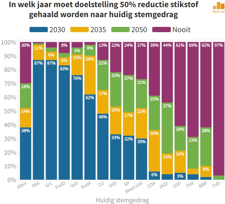 Een poll laat zien dat het doel van terugdringen van stikstof uitstoot in 2035 met 50 procent wordt gesteund door een krappe meerderheid van de bevolking (bron: Maurice de Hond, 3 juli 2022) .