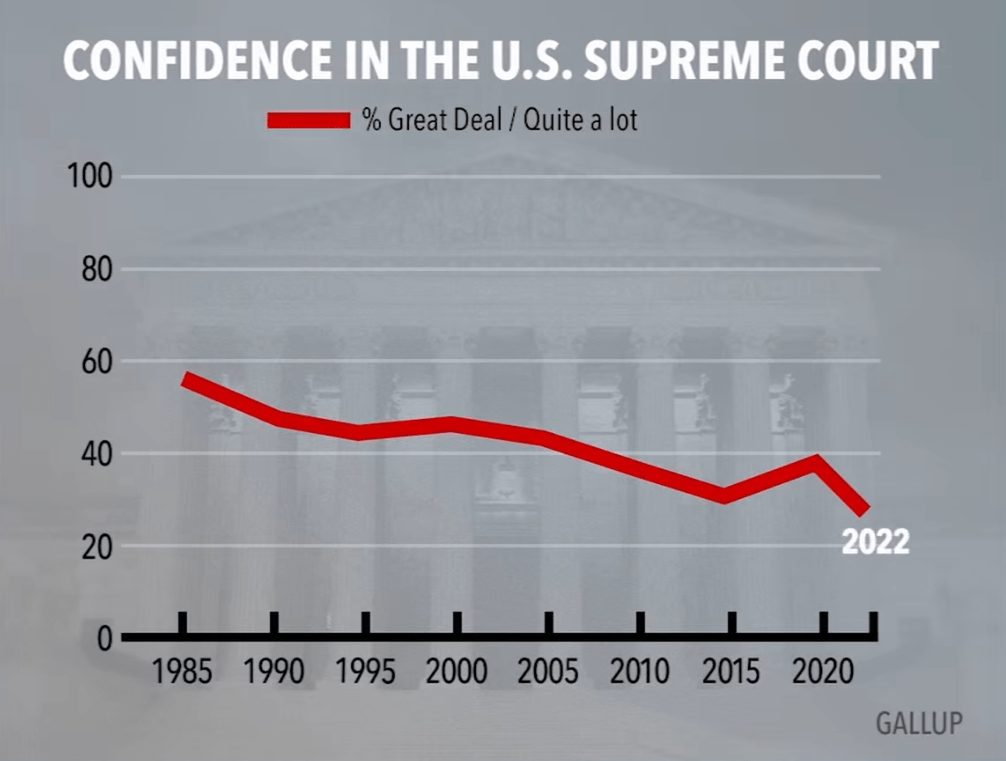 Dit onpopulaire schrappen staat niet op zich zelf. Federale instituten zijn door het parlement belast met het beperken van koolstof-emissies in elektriciteitscentrales. Deze milieuzorg wordt door het hof gefrustreerd. Basisregels binnen de federatie die consumenten, patiënten en werknemers moeten beschermen, staan op het spel. De uitspraken van het hof zijn niet meer vanzelfsprekend in overeenstemming met het land. Opinie-bureau Gallup meet in de zomer van 2022 een historisch dieptepunt van slechts 25 procent van Amerikanen die nog vertrouwen hebben in beslissingen van het hof: